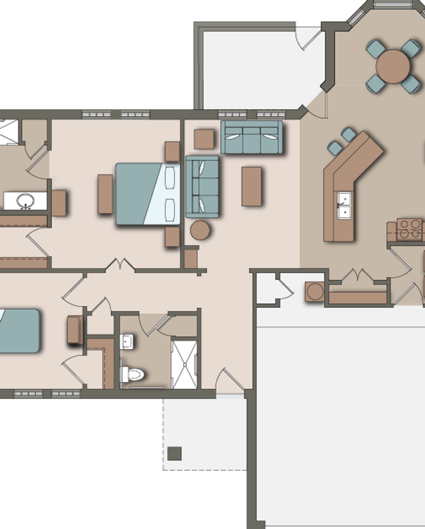 Our two-bedroom cottages offer a place to rest in luxury and include a master suite, large walk-in closets, and lots of natural lighting