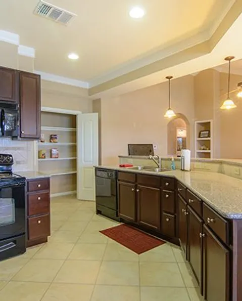 Modern appliances nestled in an easily-accessible kitchen with beautiful granite countertops, a large kitchen island, and a spacious pantry