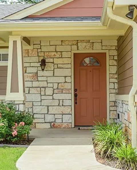 A welcoming front door porch with Texas hill country stone greets you and your guests for a home-like feeling